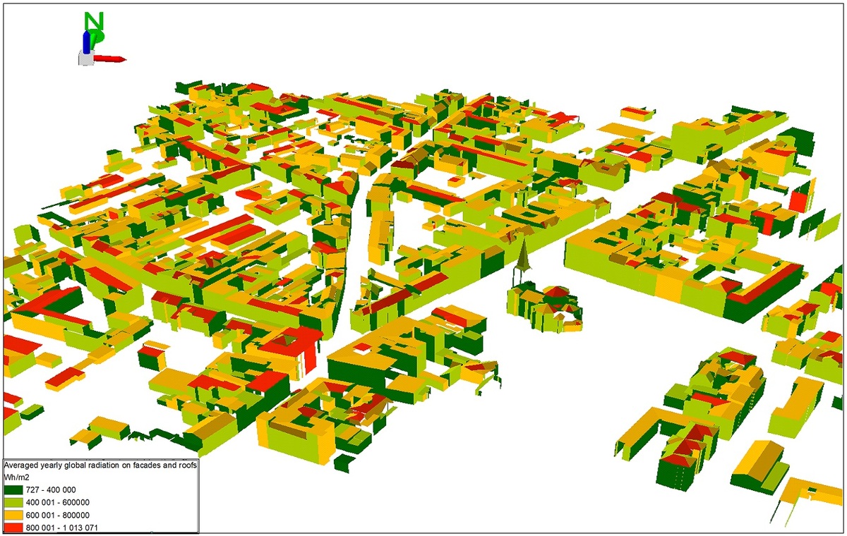 In response to the growing demand for renewable energy sources, increasing attention is being directed toward the utilization of solar energy. The possibility of harvesting solar power through photovoltaic micro-installations on building surfaces has the potential to become a significant factor influencing the market value of real estate. This article presents a methodology for the efficient assessment of solar potential on the roofs and façades of buildings, based on publicly available data sources and validated computational algorithms. The approach involves the analysis of a Digital Surface Model (DSM) and three-dimensional building models, combined with solar radiation simulations and the identification of surfaces with optimal geometric parameters and high solar potential, to evaluate their suitability for solar energy production. Using a case study of a historic city center, the potential for meeting buildings’ energy demand through photovoltaic infrastructure was assessed. Additionally, the study proposes the inclusion of solar exposure characteristics as a supplementary parameter influencing real estate valuation, while considering potential constraints from local zoning regulations.