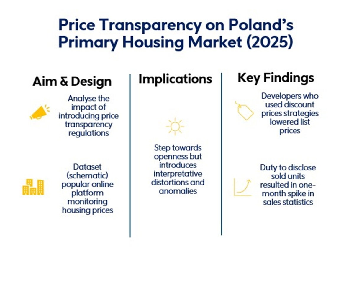 The study investigates short-term market adjustments following the introduction of price transparency requirements in Poland’s primary housing sector. Using a dataset of 57,041 dwellings across 23 cities and focusing on six major agglomerations, it analyzes how developers modified list prices and reporting practices during the 2025 rollout period.