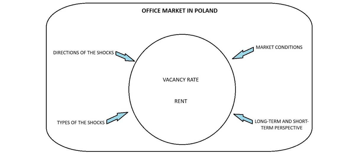 A growing body of empirical evidence suggests that adjustments on the office market are not symmetric. The theoretical framework provides various justifications for the presence of frictions, especially in the case of rent and vacancy rate. In this paper, we investigate the asymmetric reactions of rent and vacancy rate to the demand and supply shocks in the nine major office markets in Poland. In the course of the study we seek answers to two research questions. First, we investigate if the direction (positive or negative) as well as type (demand or supply) of the shocks produce asymmetry in the adjustments of vacancy rate and rent. Secondly, we examine if market conditions and distinction between the long-term and short-term perspective can generate asymmetry in vacancy rate and rent responses to the shocks.
